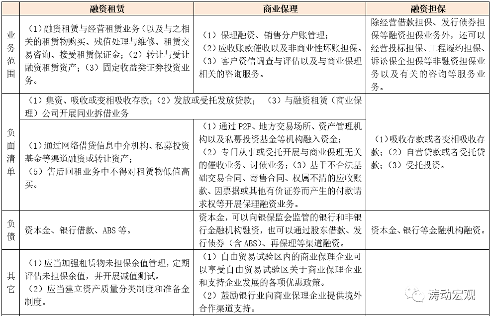 (1)在業務范圍上,除主營業務外,融資租賃公司還可以開展固定收益類證券投資業務,融資擔保公司既可以開展融資性擔保業務亦可以開展非融資性擔保業務,商業保理公司則可以開展保理融資、銷售分類賬管理、應收賬款催收、客戶資信調查等。