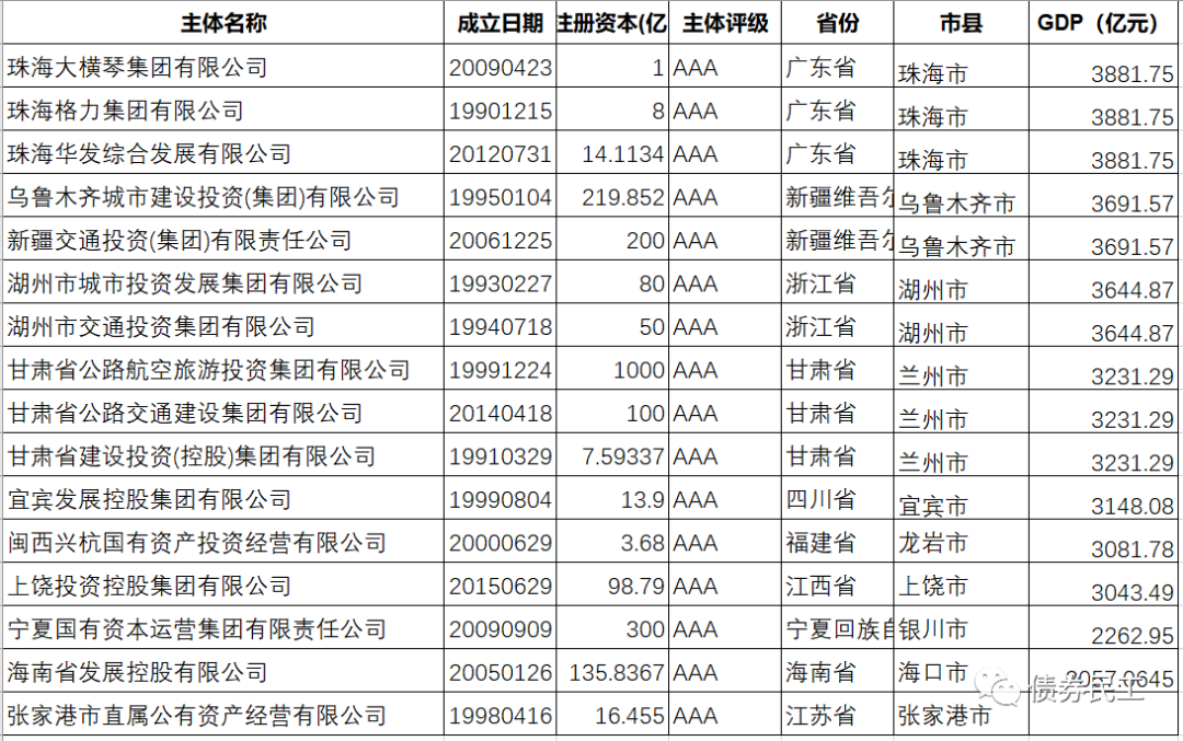 5、AAA城投公司所在區域的GDP情況。扣除掉直轄市和副省級城市,蘇州市是全國AAA城投公司GDP數據最高的地級市;吉林市是AAA城投公司GDP數據最低的地級市。目前共有16家城投公司所在區域的GDP低于4000億元。