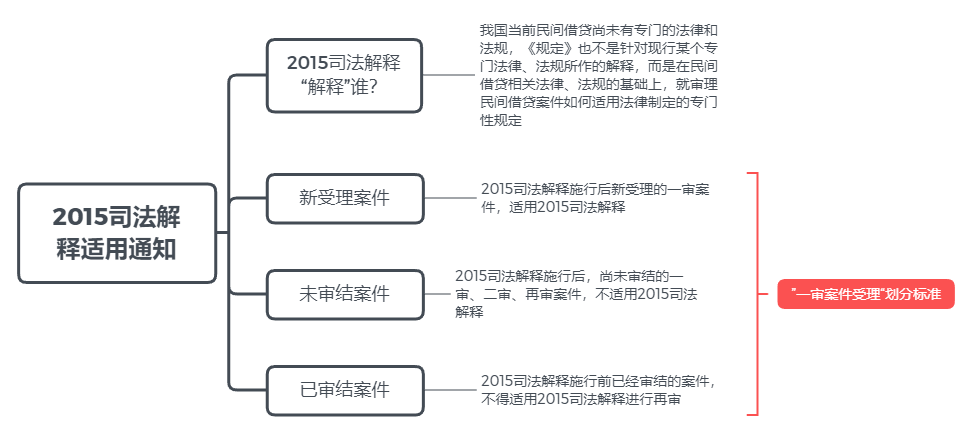 回到3808判決本身,按照8.20司法解釋第三十三條第一款“本規定施行后,人民法院新受理的一審民間借貸糾紛案件,適用本規定”,只有2020年8月20日以后新受理的一審民間借貸糾紛適用新規,才能按照8.20司法解釋劃定的四倍LPR利率司法保護上限進行裁判。當年2015年版本的民間借貸司法解釋(下稱“2015司法解釋”)發布后,同樣遇到了溯及力問題的探討和分歧,最高法院在2015年8月25日發布了《關于認真學習貫徹適用<最高人民法院關于審理民間借貸案件適用法律若干問題的規定>的通知》,拎一下重點如下: