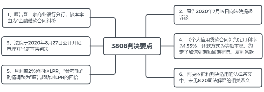 有觀點表示,8.20司法解釋第三十二條第二款規定:“借貸行為發生在2019年8月20日以前的,可參考原告起訴時一年期貸款市場報價利率四倍確定受保護的利率上限”,該款似乎可以作為3808案件作出“參照”判決的依據。