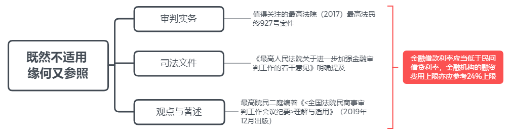 這里首先需要關注的是,對金融機構的排除適用情形是有所限縮的,即僅限于具有發放貸款業務資質的金融機構且貸款類型僅限于經營性的貸款業務。但即便如此,仍然囊括了絕大部分的金融機構貸款業務。回歸核心問題:既然不適用,緣何又參照?