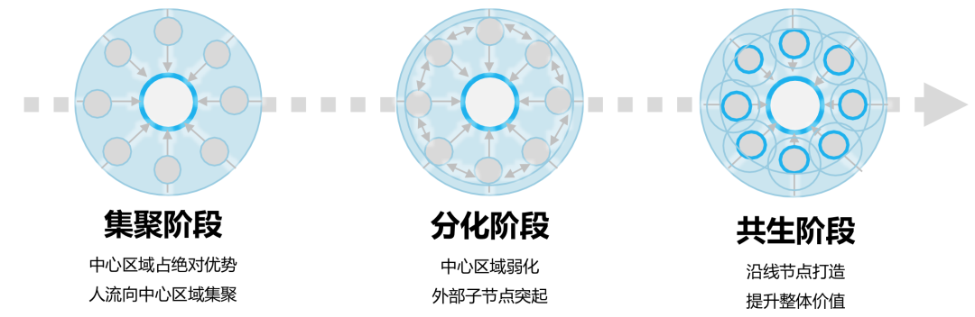 軌交經濟發展經歷了三個階段:第一個階段是以中心為核心中央集權型;第二個階段是以中心區域弱化、外部子節點突出為特征的分化階段;第三個階段則是以中心節點為源頭,沿廊道呈放射狀多節點打造為特征的共生階段。在共生階段下,沿線整體開發是在堅持可持續發展的理念下達到區域長期聚攏人氣的有效策略。