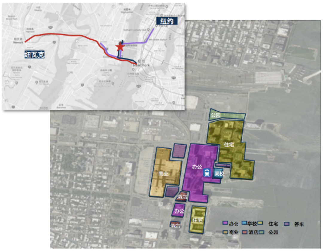 項目位于紐約與紐瓦克雙城交界處,雙地鐵共站;在設計上,站點優先布局辦公和學校功能(學校與地鐵站共樓),極大程度吸引研發及辦公人群到達;外圍配套商務人員所需的商業、公寓、酒店,延長停留時間;同時利用濱水環境良好的資源優勢建設住宅,吸引人群長期居住。借鑒兩城交界的優質區位和雙地鐵的交通優勢,成為雙城人流、產業、貿易的交匯點,通過商業和居住功能的完善吸引人口長期居住。