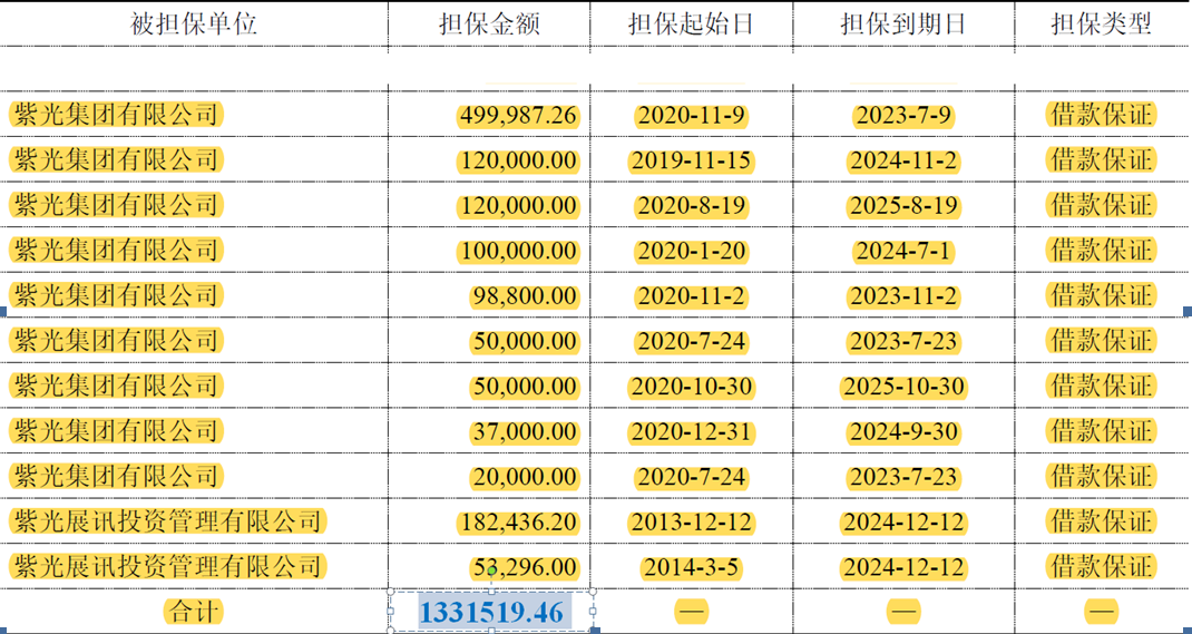 第一,對紫光集團(tuán)及其下屬紫光展訊投資管理有限公司(以下稱“紫光展訊”)的長期借款提供的無限連帶責(zé)任擔(dān)保,總擔(dān)保金額133.1519億元。其中對紫光集團(tuán)本級(jí)的擔(dān)保金額109.58億元,全部發(fā)生在2019年11月-2020年11月期間。