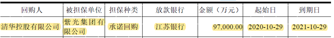 第二,為江蘇銀行于2020年10月29日為紫光集團(tuán)發(fā)放的一筆97000萬元一年期的貸款提供到期無條件回購承諾,到期時(shí)間為2021年10月29日。