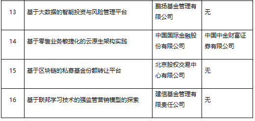 16個項目的技術應用覆蓋了大數據、云計算、人工智能、區塊鏈等新一代信息技術,以及安全多方計算、聯邦學習、云原生、信創等復合交叉技術應用;業務場景方面則涵蓋了智能投顧、智能運營、智能交易、智能風控、智能營銷等資本市場各類業務領域。
