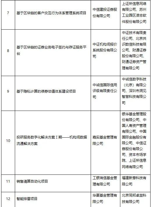 在首批擬納入試點的16個項目中,牽頭申報單位包括了4家市場核心機構、4家證券公司、5家基金管理公司、1家信用評級機構以及1家區域性股權交易市場運營機構,聯合申報單位包括多家市場核心機構、證券期貨經營機構、銀行以及科技企業。