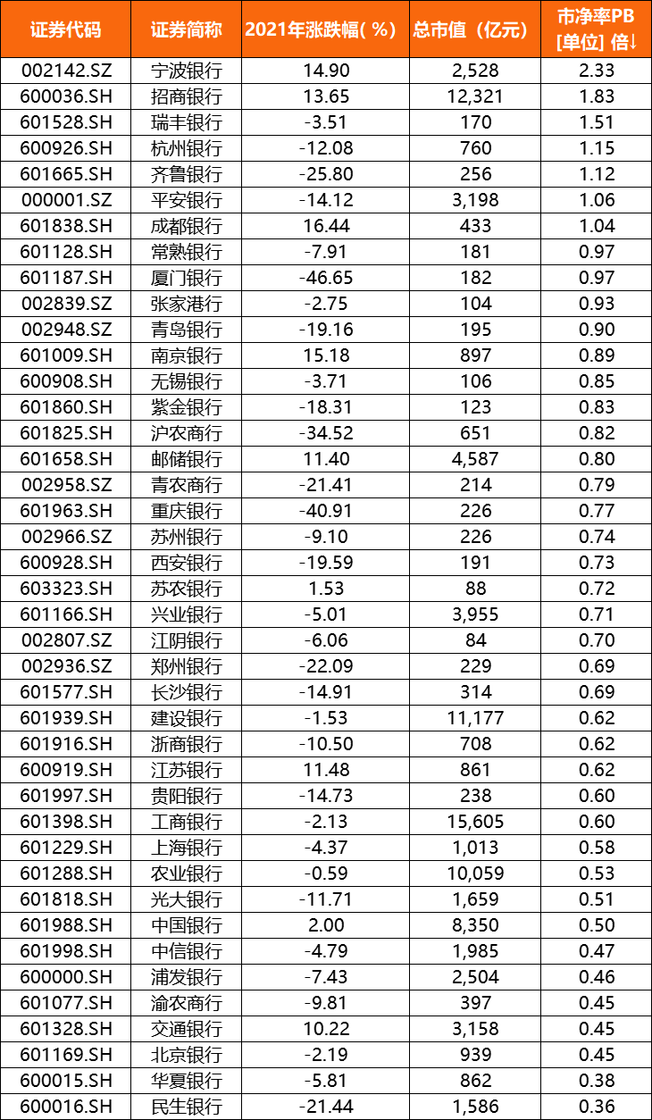 個股方面,2021年超過七成銀行股股價下跌,其中重慶銀行(601963.SH)、廈門銀行(601187.SH)股價2021年跌幅超過40%;在41家A股上市銀行中,僅有7家銀行的PB(市凈率)在1以上,其余34家銀行的PB均在1以下;同時,超過六成銀行股價跌破發行價。