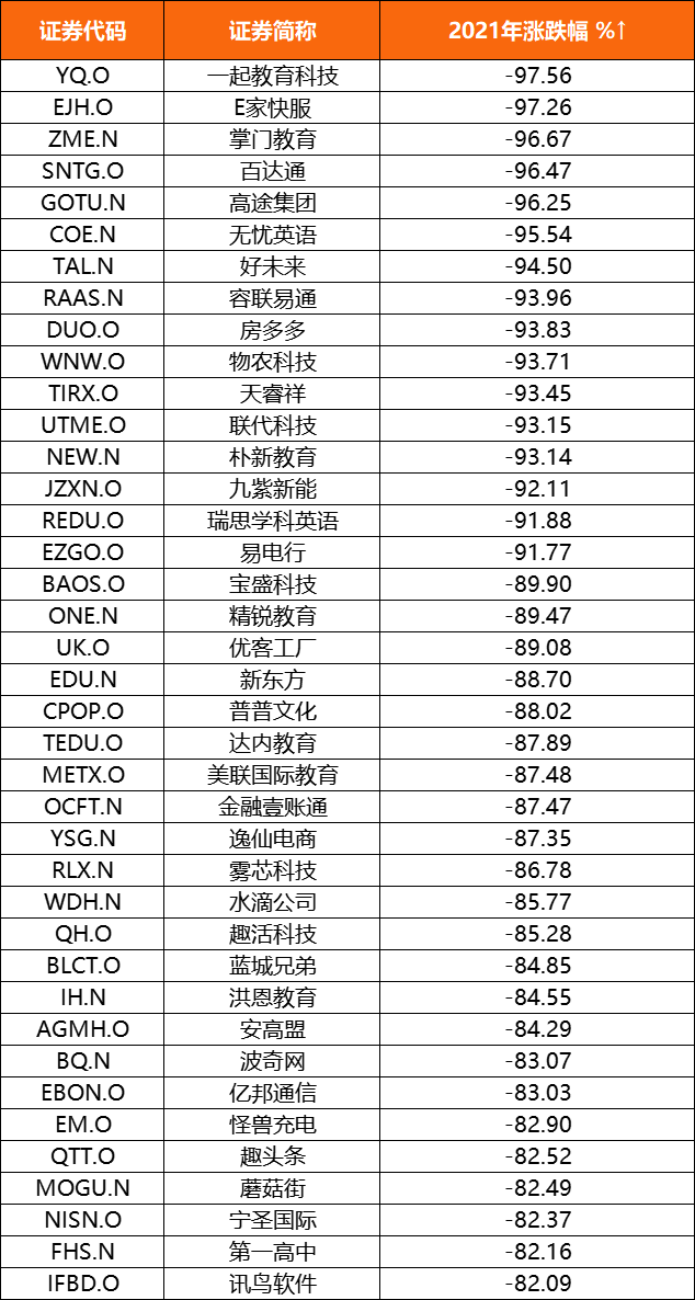 據Wind數據,2021年在美上市的281家中國概念股中,有226家股價呈現下跌狀態,跌幅超50%以上的個股有134家,跌幅超30%以上的達185家。具體來看,百度(BIDU.O)2021年下跌31%,老虎證券(TIGR.O)下跌38%,嗶哩嗶哩(BILI.O)下跌46%,阿里巴巴(BABA.N)下跌49%,陸金所控股(LU.N)下跌超60%,拼多多(PDD.O)下跌超過67%,慧擇(HUIZ.O)下跌超過79%,金融壹賬通(OCFT.N)下跌超過87%。