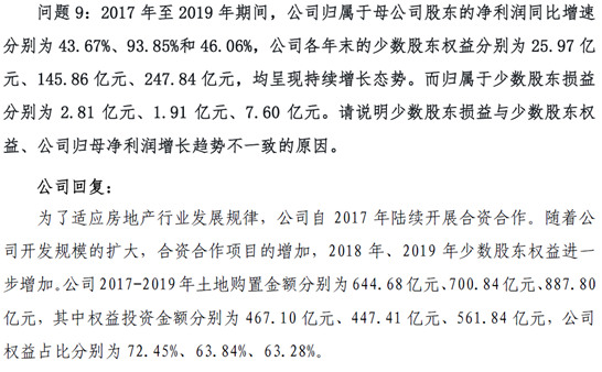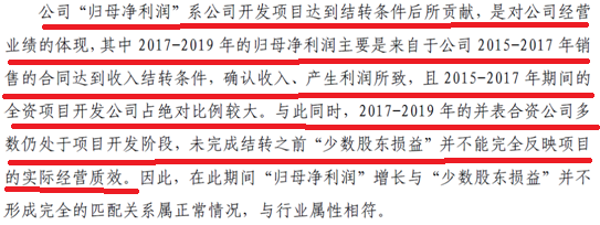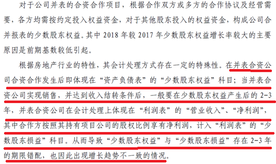 不可以。很多賣方的報(bào)告是存在錯(cuò)誤的。應(yīng)該說明股實(shí)債會(huì)導(dǎo)致權(quán)益比和損益比之間存在差異,但并不能說這兩個(gè)指標(biāo)之間存在差異就是因?yàn)槊鞴蓪?shí)債,因?yàn)閷?dǎo)致這兩個(gè)指標(biāo)產(chǎn)生差異的原因有很多,并且最核心的因素也不是明股實(shí)債。比如我們在文首指出的地產(chǎn)公司由于預(yù)收制度的存在導(dǎo)致收入確認(rèn)和利潤分配存在滯后。也就是說,這兩年合作開發(fā)比較多,那么非并表全資子公司的投入在當(dāng)期就計(jì)入了少數(shù)股東權(quán)益,但是這些項(xiàng)目要達(dá)到收入確認(rèn)條件至少是2-3年之后的事情,因此這就會(huì)造成權(quán)益比和損益比之間出現(xiàn)差異。也就是說,小股東雖然現(xiàn)在出資了,但是分配利潤要等到2-3年之后,這就會(huì)使得當(dāng)期的少數(shù)股東損益占比小于少數(shù)股東權(quán)益占比。結(jié)合現(xiàn)實(shí)情況可知,合作開發(fā)也就是17年逐步開始出現(xiàn)的,也就是說,17年合作的項(xiàng)目,當(dāng)年小股東的投入已經(jīng)計(jì)入了少數(shù)股東權(quán)益,但是這些項(xiàng)目要達(dá)到結(jié)轉(zhuǎn)條件基本要到2020年,所以在利潤表上是這幾年都不會(huì)有分配,這個(gè)原因是造成這幾年二者之間差異的最重要原因。此外,還有其他因素會(huì)導(dǎo)致這一差異,比如不同項(xiàng)目之間盈利情況是存在差異的,比如有的小股東在達(dá)到收入確認(rèn)條件前會(huì)提前退出等等。