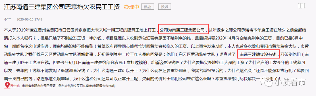 2020年6月,有網(wǎng)友在人民網(wǎng)《領導留言板》向貴陽市委書記反映,南通三建拖欠農(nóng)民工工資。后經(jīng)白云區(qū)人社局協(xié)調,南通三建才將所拖欠9名員工工資全部發(fā)放,共計15.64萬元。