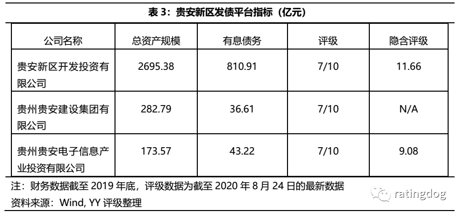 貴安新區(qū)目前有三家城投平臺(tái),YY評(píng)級(jí)均為7/10,隱含評(píng)級(jí)更高,資質(zhì)較弱。資產(chǎn)規(guī)模最大的貴安新區(qū)開(kāi)發(fā)投資有限公司是貴安新區(qū)內(nèi)唯一的開(kāi)發(fā)主體,承擔(dān)新區(qū)基礎(chǔ)設(shè)施建設(shè)、產(chǎn)業(yè)園區(qū)建設(shè)、投融和產(chǎn)業(yè)發(fā)展的職責(zé),截至2019年底總資產(chǎn)規(guī)模為2695.38億,有息債務(wù)為810.91億。其余兩家發(fā)債平臺(tái)的資產(chǎn)規(guī)模和有息債務(wù)規(guī)模均較小,其中貴州貴安建設(shè)集團(tuán)有限公司為貴安新區(qū)開(kāi)發(fā)投資有限公司的全資子公司,是貴安新區(qū)重要的基礎(chǔ)設(shè)施和公用事業(yè)建設(shè)主體,貴州貴安電子信息產(chǎn)業(yè)投資有限公司截至19年底總資產(chǎn)為282.79億,有息債務(wù)為36.61億,主要承擔(dān)貴安電子信息產(chǎn)業(yè)園的開(kāi)發(fā)建設(shè)、投融資、產(chǎn)業(yè)發(fā)展、資產(chǎn)經(jīng)營(yíng)管理及招商引資等工作。