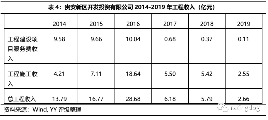 具體業(yè)務(wù)方面,安置房銷售是公司2017年新增的業(yè)務(wù),為委托代建模式,由土儲(chǔ)中心將安置房項(xiàng)目委托給公司代建,待建成后按照“成本+稅費(fèi)+利潤(rùn)”的定價(jià)原則由土儲(chǔ)中心付款。作為新區(qū)最主要的基建開(kāi)發(fā)主體,公司的工程施工業(yè)務(wù)可反映新區(qū)的基建進(jìn)度安排。2016-2019年,公司工程施工業(yè)務(wù)板塊新簽合同總額分別為1.81億、26.57億、2.45億和2.07億。可以看出,公司打算新造的工程項(xiàng)目在2017年后大幅下降。公司的工程收入16年最高達(dá)到28.68億,之后大幅下降,也可同步印證得出,貴安新區(qū)的基建工程建造的腳步在大幅放緩。
