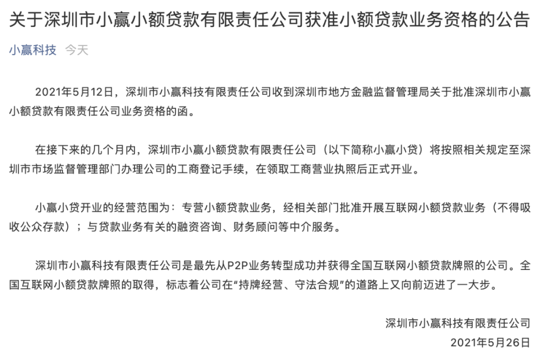 5月26日,小贏科技發布公告稱,公司收到深圳市地方金融監督管理局關于批準深圳市小贏小額貸款有限責任公司業務資格的函,取得全國互聯網小額貸款牌照。