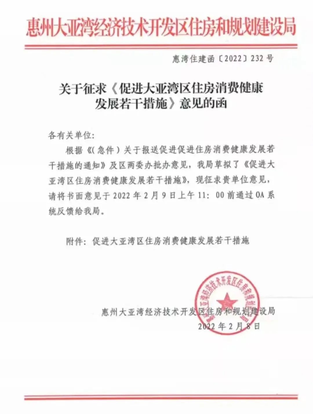 2月9日,一份蓋有“惠州大亞灣經(jīng)濟(jì)技術(shù)開(kāi)發(fā)區(qū)住房和建設(shè)局”公章,名為關(guān)于征求《促進(jìn)大亞灣區(qū)住房消費(fèi)健康發(fā)展若干措施》意見(jiàn)函在網(wǎng)上流傳。
