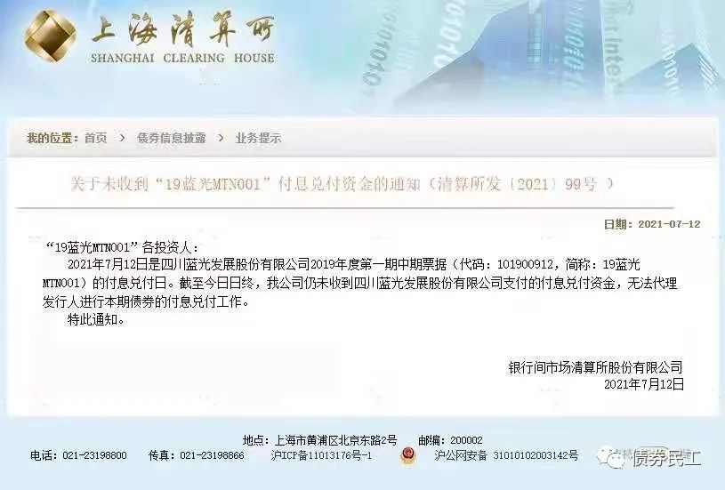 藍光發展已于2021年7月12日正式債券違約,目前違約債務金額合計為241.71億元(截至2021年11月8日)。根據上海清算網2021年7月12日的公告,藍光發展發行的“19藍光MTN001”未能按時支付付息兌付資金,構成了實質性債券違約。這是繼泰禾集團、華夏幸福違約之后的第三家千億房企發生債券實質性違約。