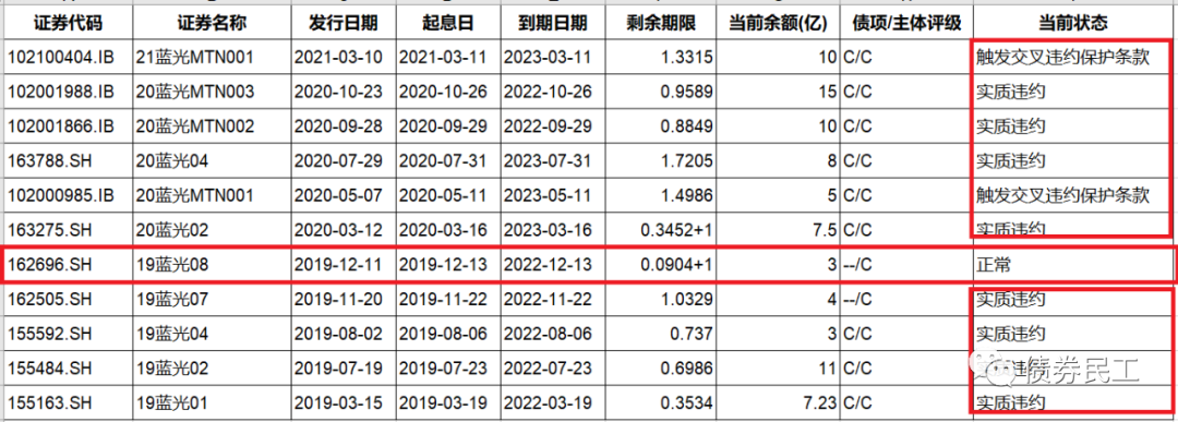 藍光發展目前國內信用債券市場存續債券11只,存續金額83.73億元,存存續債券產品包括中期票據、小公募和私募債。目前,藍光發展的存續債券除“19藍光08”為正常存續外,其余債券均已處于實質違約或者處罰交叉違約保護條款,具體債券明細詳見下圖: