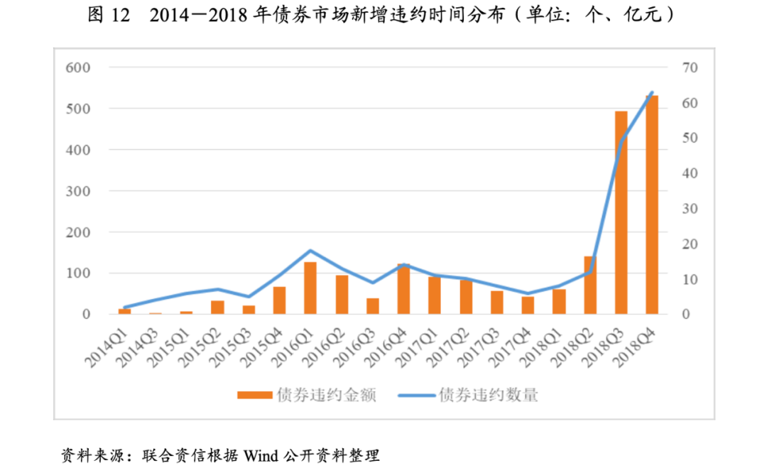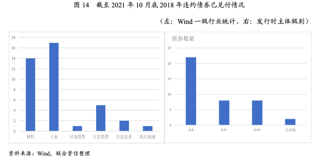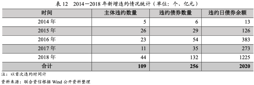 各年份違約主體違約前信用評級呈現明顯的遷移態勢,2014年違約主體的信用評級較低,或無信用評級,隨后違約主體信用級別逐漸升高和分散化,直至2017年,級別最高的違約債券違約前主體信用評級提高至AA+,2018年,幾乎各個級別都出現了違約情況。