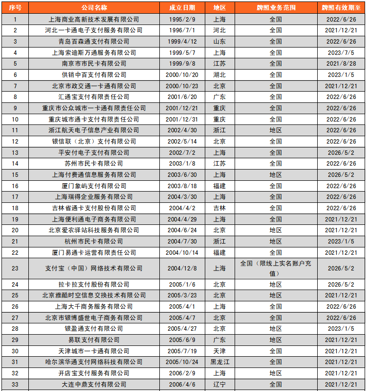 2021年5月13日,央行官網公布首批27張支付牌照續展結果,支付寶、財付通、銀聯商務、資和信、銀盛支付、通聯支付等24家支付機構全部通過續展。廣州銀聯網絡支付有限公司、北京數字王府井科技有限公司、北京銀聯商務有限公司擬與其控股股東銀聯商務股份有限公司開展整合工作,向人民銀行提交了中止續展審查申請,在中止審查期間繼續開展業務。