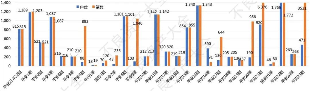 其中,中國銀行2022年第1期戶數(shù)最少,可謂袖珍資產(chǎn),僅有18戶。第二少的平安銀行2022年第7期也有43戶,是前者的兩倍多。平安銀行的資產(chǎn)戶數(shù)普遍比較多,28期中戶數(shù)最多的為平安2022年第22期,共1,766戶。