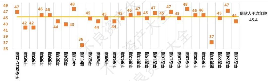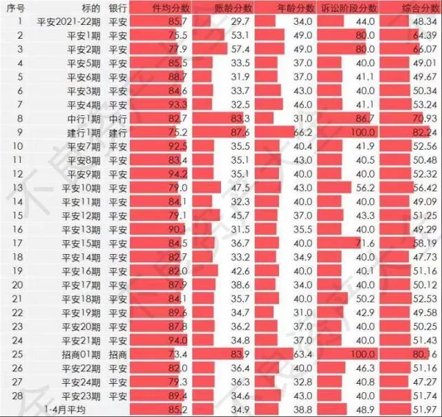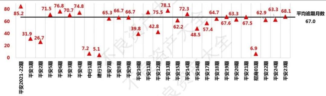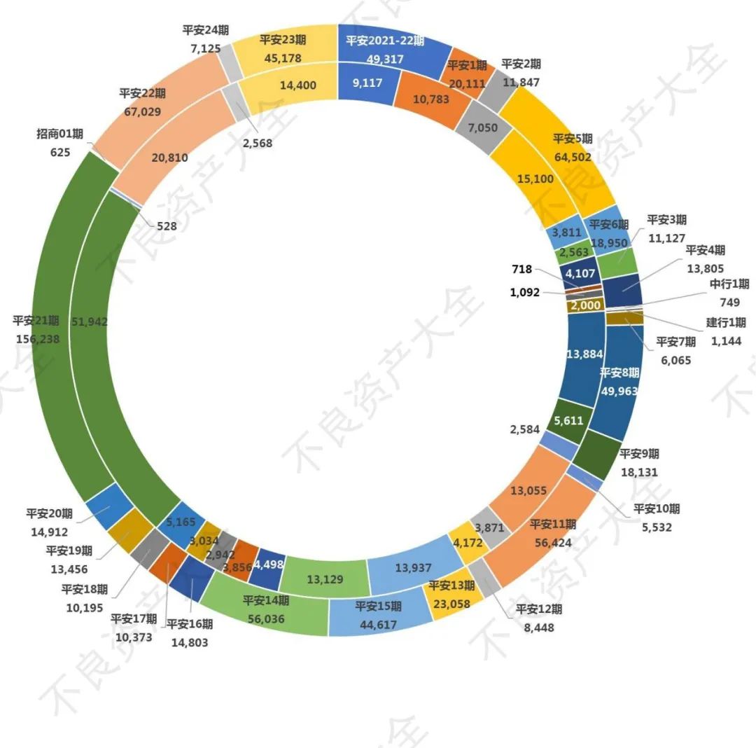 特別地,賬齡最短的三期為:建設(shè)銀行2022年第1期賬齡為5個月多,招商銀行2022年第1期賬齡為不到7個月,中國銀行2022年第1期賬齡為7個月多。有意思的是,這3期為1-4月28期中唯三不是平安銀行的不良資產(chǎn),且賬齡都在半年左右。可見單從賬齡角度看的話,這三家銀行誠意十足。