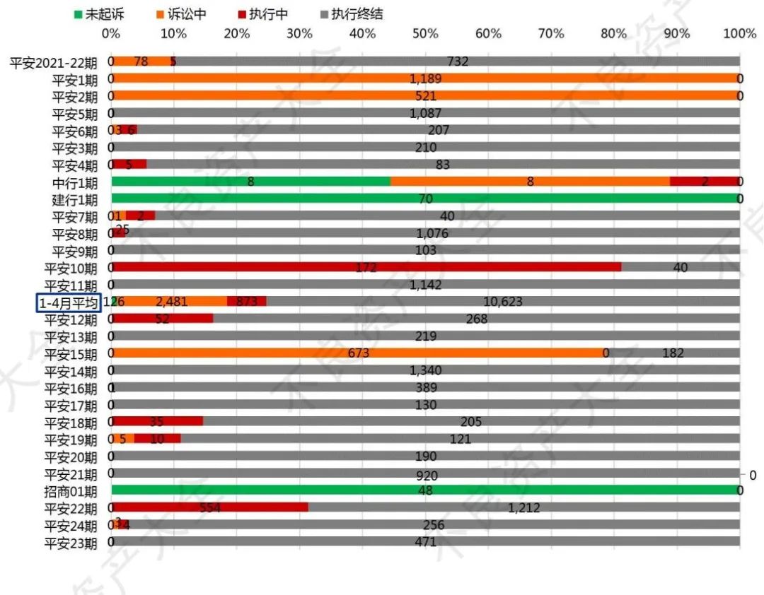 平均而言在共計14,067戶不良貸款中,未起訴、訴訟中、執(zhí)行中及執(zhí)行終結(jié)的分別有126戶、2,481戶、873戶及10,623戶,分別占總戶數(shù)的0.9%、17.6%、6.2%及75.5%。由于平安銀行的加持,以債務(wù)人角度看四分之三以上的不良資產(chǎn)均已終本。