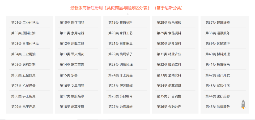 商標注冊申請前要對商品類別進行選擇,對于商品類別,我國基于尼斯商品分類制定了《類似商品和服務(wù)區(qū)分表》,將所有商品及服務(wù)共劃分為45個類別,其中:1-34是商品類別,35-45是服務(wù)類別,包含上萬個商品及服務(wù)。