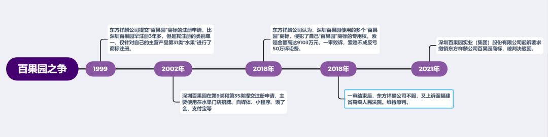 百果園作為水果品牌在市場上享有很高的知名度,但少有人知的是擁有“百果園”商標的公司其實有兩家,一家是深圳百果園實業(yè)發(fā)展有限公司,一家是東方祥麟蘋果基地有限公司。兩家公司的不同之處在于,期擁有的是不同商品類別的“百果園”注冊商標,我們常見的百果園旗艦店,一般屬于深圳百果園實業(yè)發(fā)展有限公司,而東方祥麟公司旗下的“百果園”品牌知名度并沒有那么高,但出人意料的是,東方祥麟公司反而比深圳百果園公司更早注冊“百果園”商標。這一事件被大眾了解還源于去年的近億元索賠案件。兩家公司都擁有“百果園”商標,但注冊類別不同,引發(fā)了商標糾紛。