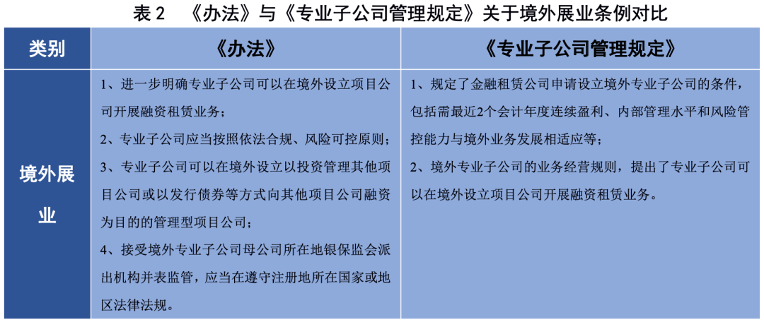 《辦法》的推出有利于規范金融租賃公司境外展業。2014年,原銀監會出臺《中國銀行業監督管理委員會辦公廳關于印發金融租賃公司專業子公司管理暫行規定的通知》(以下簡稱《專業子公司管理規定》),首次指出了金融租賃公司可以設立境外專業子公司,規定了金融租賃公司申請設立境外專業子公司的條件、境外專業子公司的業務經營規則。此次《辦法》為規范金融租賃公司境外展業的有效補充,明確了專業子公司可以在境外設立項目公司開展融資租賃業務,專業子公司應當按照依法合規、風險可控原則,保持境外項目公司層級結構清晰、簡單、透明;要求境外項目公司原則上不得超過2級。《辦法》新增了專業子公司可以在境外設立以投資管理其他項目公司或以發行債券等方式向其他項目公司融資為目的的管理型項目公司,設立管理型項目公司將促進項目公司業務規范管理,同時便于境外項目公司融資。此外,境外專業子公司設立的項目公司應當接受境外專業子公司母公司所在地銀保監會派出機構并表監管,應當遵守注冊地所在國家或地區的法律法規。