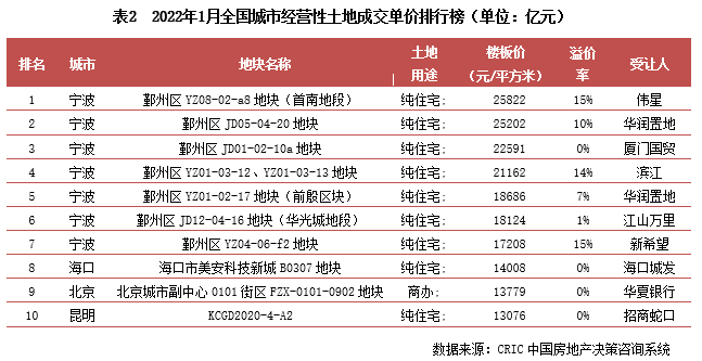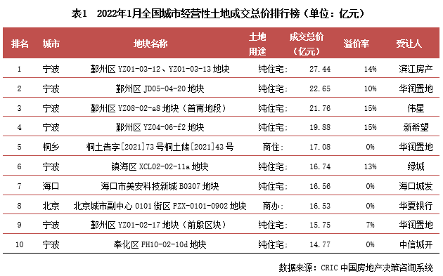原標題: 土地月報 | 成交規模周期性縮量,寧波拍出第三輪集中供地最高溢價(2022年1月)