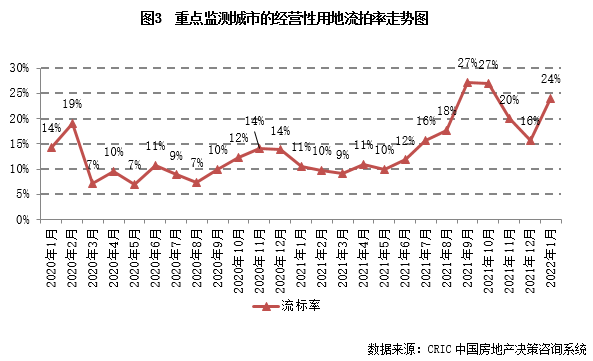 土地流拍方面。由于優質地塊占比較少,資金流仍面臨較大壓力的房企本月拿地意愿不強。因此,開年首月流拍現象較去年年末有所加重。以重點監測的城市來看,1月土地流拍率并未延續去年年末的下降趨勢,反而回升至24%的較高水平。從流拍地塊所在城市來看,大部分流拍地塊集中在樓市處于調整周期的城市,如大連、哈爾濱、清遠、揭陽等,并且這些地塊多為含宅地塊。以大連為例,1月份主城區計劃出讓的5幅宅地全部因無人競價而流拍,土地市場明顯遇冷。