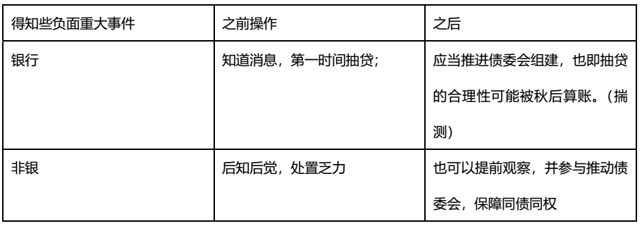 一句應(yīng)當(dāng),應(yīng)當(dāng),是風(fēng)險(xiǎn)防范的意識(shí)要求,也是監(jiān)管對(duì)于粗放式金融管理的精細(xì)化進(jìn)階要求,因而后續(xù)可能債委會(huì)更為時(shí)髦,不一定是此前的已經(jīng)到難以為繼的狀態(tài)才設(shè)立。