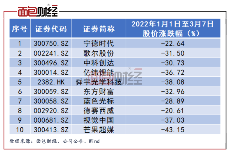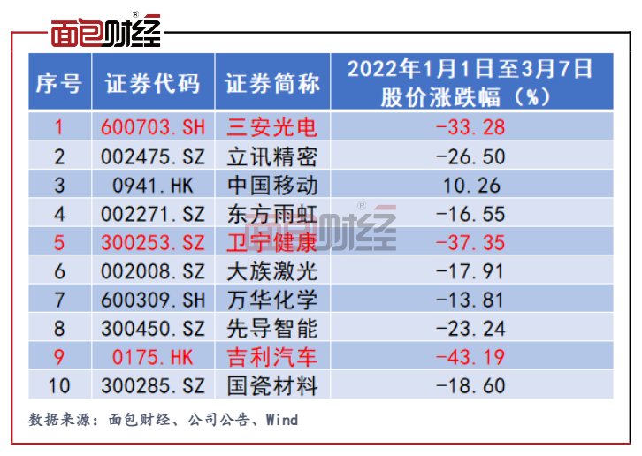 2022年初至3月7日收盤,三安光電股價一路下行,區(qū)間跌幅達33.28%。除了三安光電之外,睿遠成長價值A前十大重倉股中的吉利汽車今年以來跌幅達43.19%;衛(wèi)寧健康跌幅達37.35%。