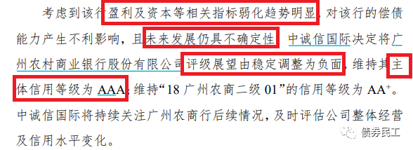 根據(jù)wind披露的公告信息,2021年4月19日,中誠信國際將廣州農(nóng)村商業(yè)銀行股份有限公司(以下簡稱“廣州農(nóng)商行”)的評級展望調(diào)整為負(fù)面,維持主體信用評級AAA。評級展望調(diào)整為負(fù)面的主要原因是盈利指標(biāo)弱化趨勢明顯、未來發(fā)展存在不確定性。