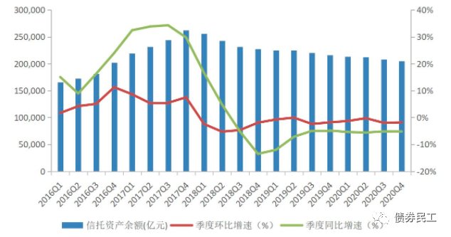 從信托資產規模數據來看,截至2020年底,信托資產規模為20.49萬億元,同比2019年下降5.17%,較2017年底信托資產最高峰的26.25萬億元下降了5.76萬億,下降了21.94%!(數據來自于中國信托業協會公布的數據)