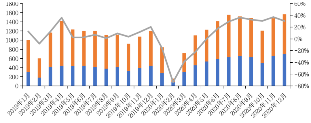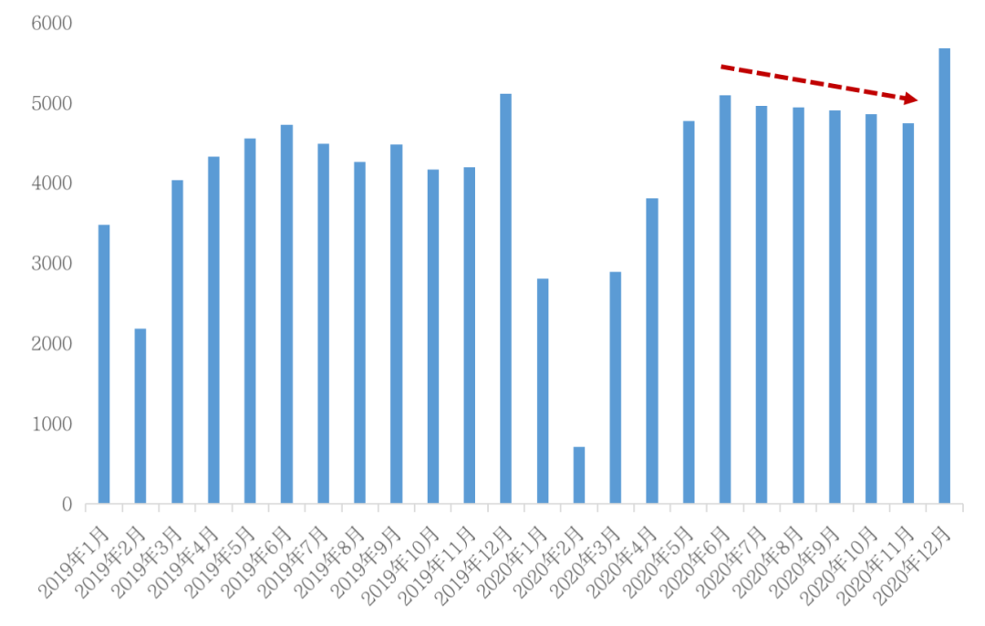 圖:2020年1-12月100個(gè)典型城市新建商品住宅月度成交情況(單位:萬平方米)