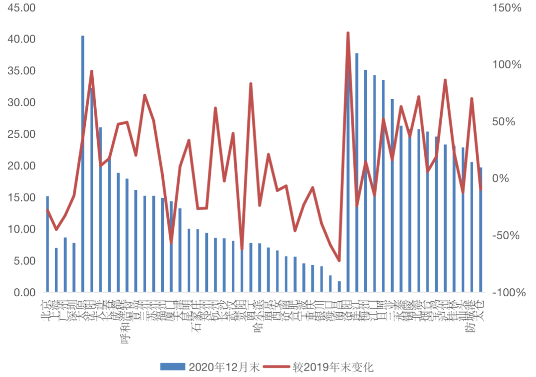 截至到12月末CRIC監(jiān)測(cè)的100個(gè)重點(diǎn)城市庫存量達(dá)到了57995萬平方米,較2019年末上升了9%,不同城市漲跌參半,百城中有14個(gè)庫存消化周期高于24個(gè)月,大部分為缺乏基本面支撐的三四線城市,庫存風(fēng)險(xiǎn)浮出水面。