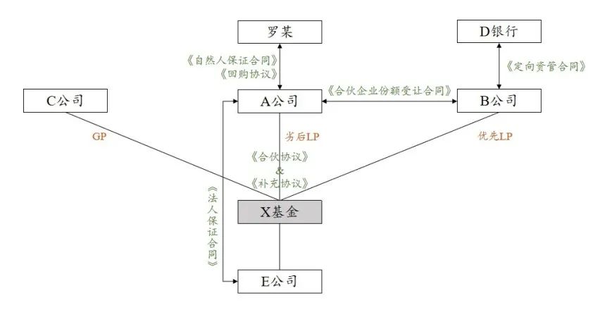 根據(jù)公開信息,A公司(劣后級LP)與B公司(優(yōu)先級LP)、C公司(GP)簽訂《合伙協(xié)議》及其《補充協(xié)議》,《補充協(xié)議》中約定優(yōu)先級LP對合伙企業(yè)出資的前提包括《合伙企業(yè)份額受讓合同》及《法人保證合同》簽訂生效。隨后,“X投資管理中心(有限合伙)”(簡稱“基金”) 成立并完成備案,后基金財產(chǎn)名義上用作E公司增資擴股的投資款。