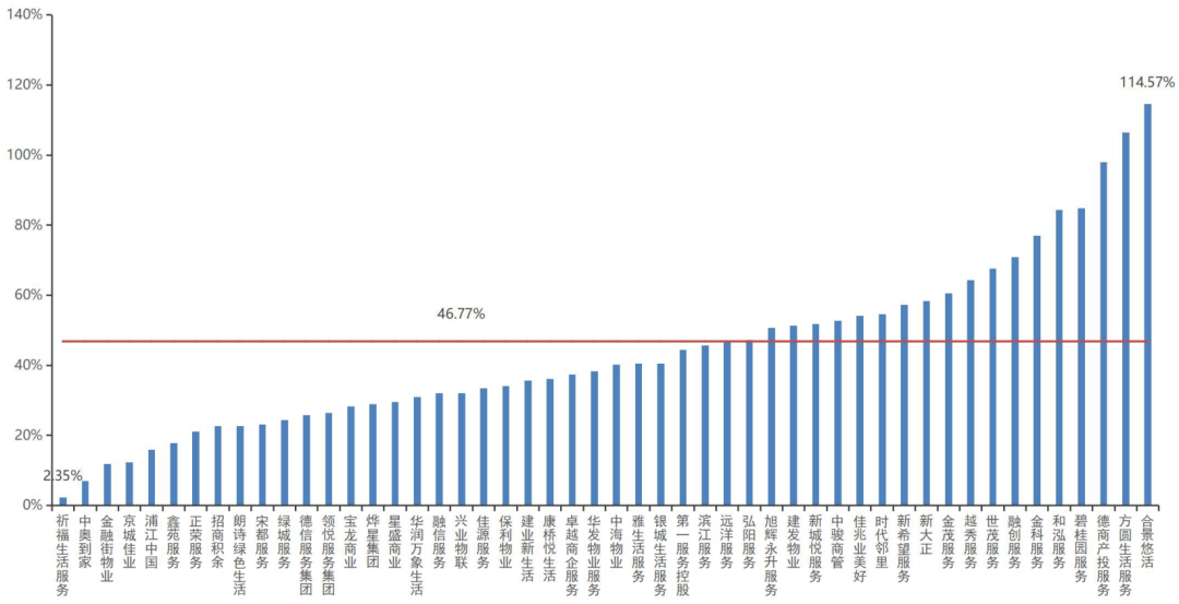 增值服務毛利率高于基礎物業(yè)服務毛利率,且社區(qū)增值服務的毛利率更高。其中,佳源服務基礎物業(yè)服務毛利率最高,達30.37%,濱江服務社區(qū)增值服務毛利率最高,為71.31%,建業(yè)新生活非業(yè)主增值服務毛利率最高,達49.64%。