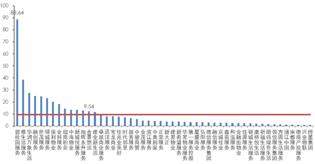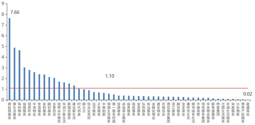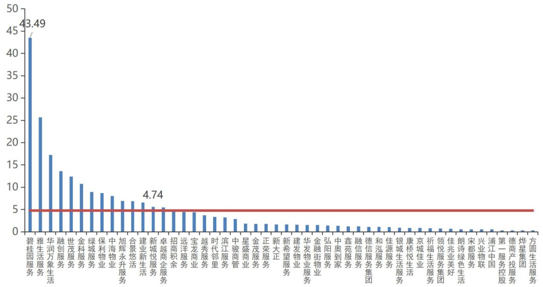 2021年披露年度在管面積的49家上市物企中,在管規(guī)模超過億平方米量級的物企達16家,超過均值(1.10億平方米)的物企為14家。其中,碧桂園服務在管面積達7.66億平方米,躍居上市物企在管規(guī)模之首;雅生活服務、保利物業(yè)和綠城服務在管面積均超過3億平方米;在管面積前五的企業(yè)規(guī)模總值達23.05億平方米,在上市物企中總規(guī)模占比超四成,上市物企的分化日益加大。