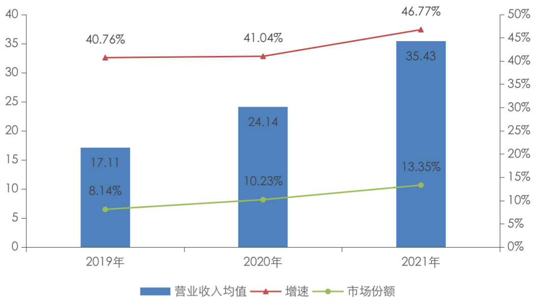 隨著物業(yè)管理規(guī)模的擴大和服務的多元化,物企經營業(yè)績持續(xù)高質量發(fā)展,多家物企表現(xiàn)亮眼,營業(yè)收入實現(xiàn)跨越式增長。50家上市物企營業(yè)收入總值由2019年的855.67億元增長至1771.28億元,均值由17.11億元增至35.43億元,復合增長率達43.88%。上市物企營業(yè)收入的市場集中度持續(xù)提升,2019年至2021年,50家上市物企在行業(yè)中的市場份額由8.14%增長至約13.35%。