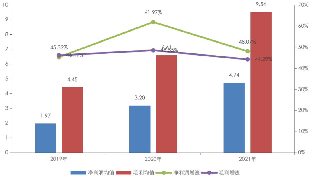 2019-2021年上市物企凈利潤、毛利均值及其增速(億元)