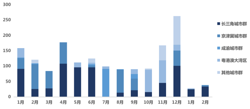 內地大宗成交物業城市群分布(成交金額,2020.01-2021.02)