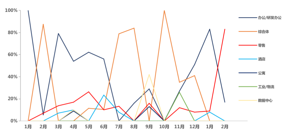 從總體投資業態偏好來看,2020年數據中心和工業/物流成為大宗交易的新興熱點,2021前2月暫未有兩種業態的成交披露,辦公和商業仍為1-2月的成交主力業態。
