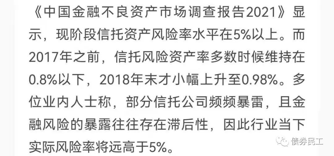 不只是融資類(lèi)信托產(chǎn)品的規(guī)模在下降,信托資產(chǎn)風(fēng)險(xiǎn)率水平也在提高。根據(jù)《中國(guó)金融不良資產(chǎn)市場(chǎng)調(diào)查情況報(bào)告》的統(tǒng)計(jì)數(shù)據(jù),2017年之前信托資產(chǎn)風(fēng)險(xiǎn)率維持在0.8%以內(nèi),但是現(xiàn)在信托行業(yè)的實(shí)際風(fēng)險(xiǎn)率將遠(yuǎn)高于5%。