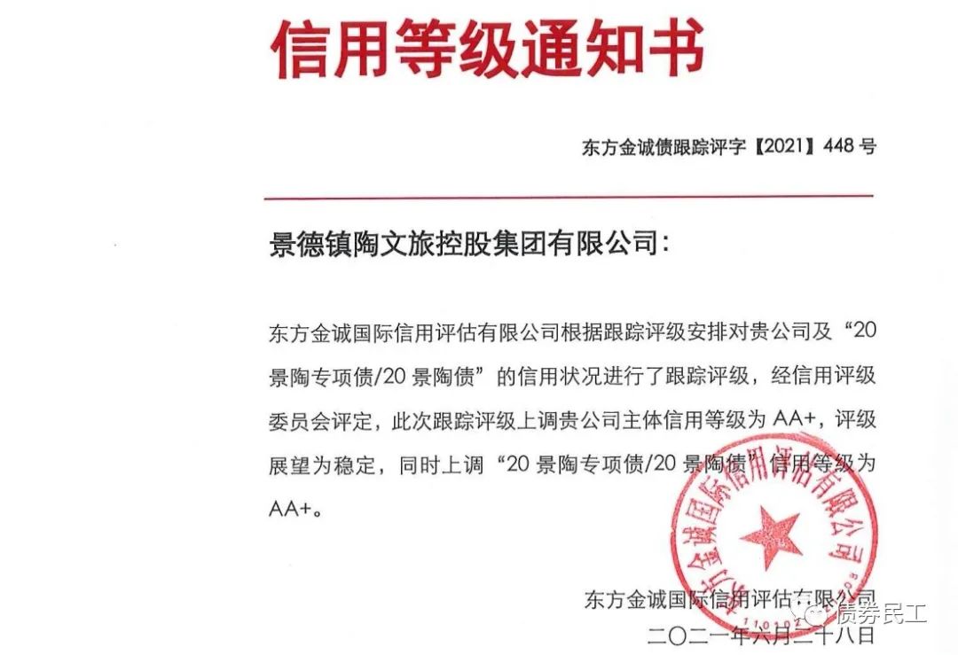 根據東方金誠2021年6月28日出具的跟蹤評級報告,景德鎮陶文旅控股集團有限公司(以下簡稱“景德鎮陶文旅”)的主體信用評級上調至AA+。本次評級上調的原因可能包括:景德鎮經濟實力很強、主營業務區域專營性很強、股東資產劃撥等。