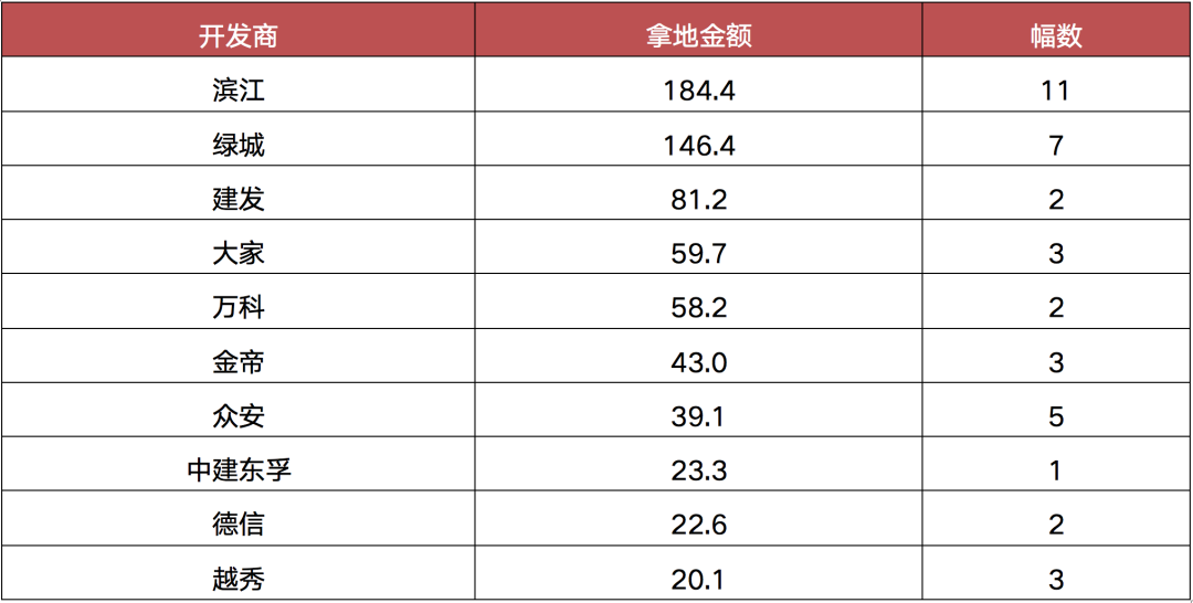 從房企拿地來看,本土民企表現活躍,尤其是濱江成為最大贏家,本輪拿下11幅地塊,拿地金額超過180億元,而綠城則緊隨其后。外來房企仍然以資金實力充沛的央企和國企為主,比如如大悅城、保利、招商、越秀、華潤、中鐵建、建發等均積極參拍