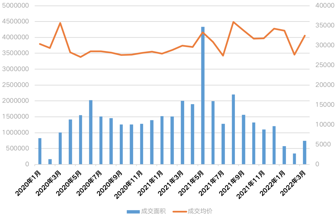 圖:2020年1月-2022年3月杭州商品住宅成交量價(萬平方米、元/平方米)