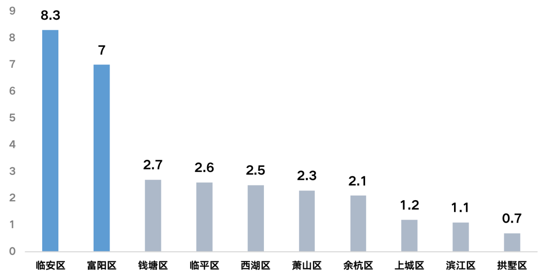 從去化來看,雖全市商品住宅去化僅為4.2個月,但臨安、富陽區的商品住宅去化周期顯著高于其他區域,分別為8.3個月和7個月。