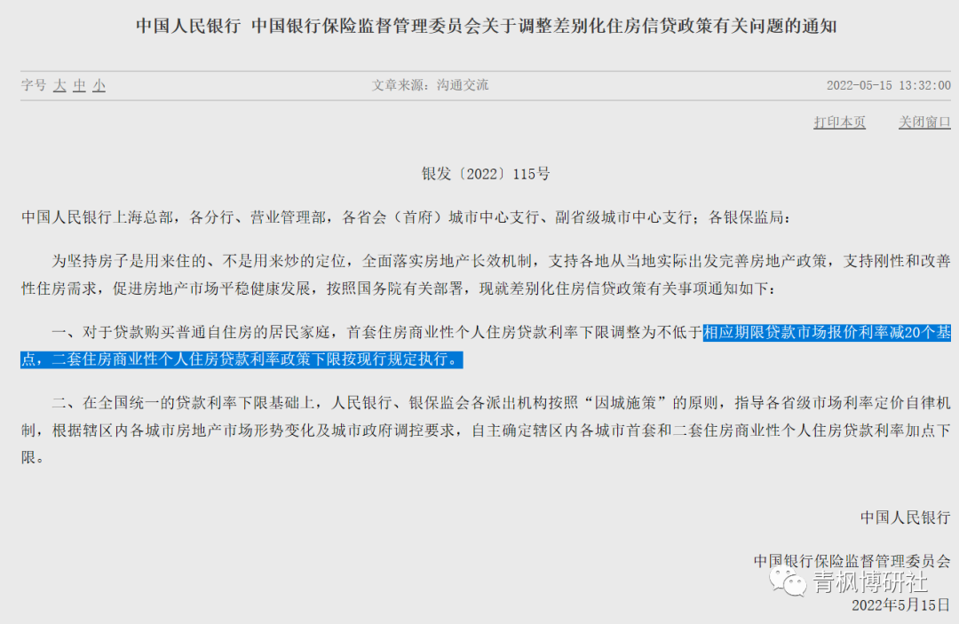(一)2022年5月15日,央行和銀保監(jiān)會聯(lián)合發(fā)布《關于調(diào)整差別化住房首套住房信貸政策有關問題的通知》(銀發(fā)(2022)115號),明確首套住房貸款利率下限調(diào)整為LPR-20BP,二套房貸款利率下限按現(xiàn)行規(guī)定執(zhí)行。